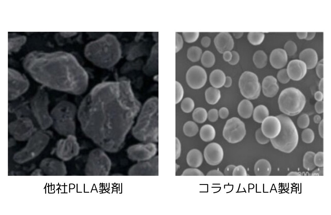 それに比べてコラウムは粒子を丸くし良く広がるように従来のPLLA製剤よりも吸収力もあがりました。