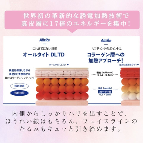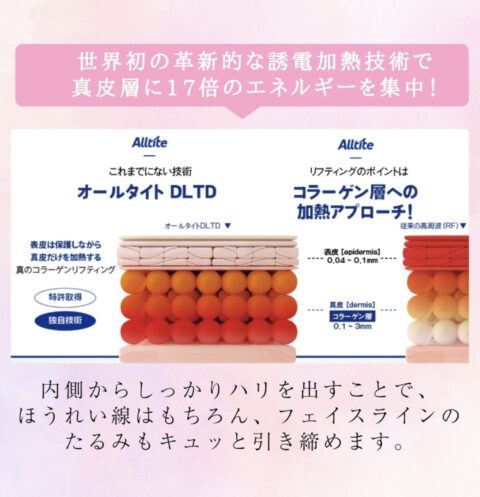 「DLTD』と言う、新しい誘電加熱システムにて真皮層、筋膜層までアプローチし、タイトニングとリフトアップに即効性があります。どちらにもアプローチすると言うことで、