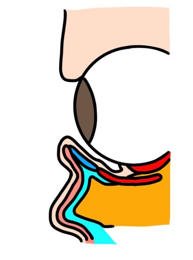 略図となりますが、側面から見て、黄色のが脂肪です。眼窩脂肪は突出してる
