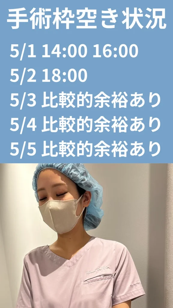 手術の進行具合でお待たせするお時間も発生するかもなのでお時間に余裕を持ってお越しください。