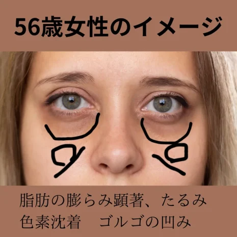 目の下の皮膚は、適度な弾力がある場合、脂肪を取るだけで自然に収縮し、たるみが残りにくいです。60代までの方は、脱脂術だけで十分な改善が期待できます。