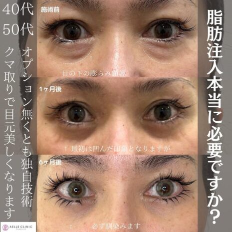 目の下のクマの中でも、黒クマ(影クマ)の原因が脂肪の突出である場合、脱脂術のみで十分に改善可能です。60代までの方であれば、しっかりと馴染むので、追加処置は不要なことが多いです。